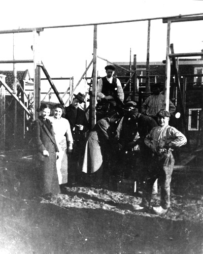 Het in aanbouw zijnde huis van de Fam. Paap aan de Relweg. De man met de hoed is Gerrit Schellevis.